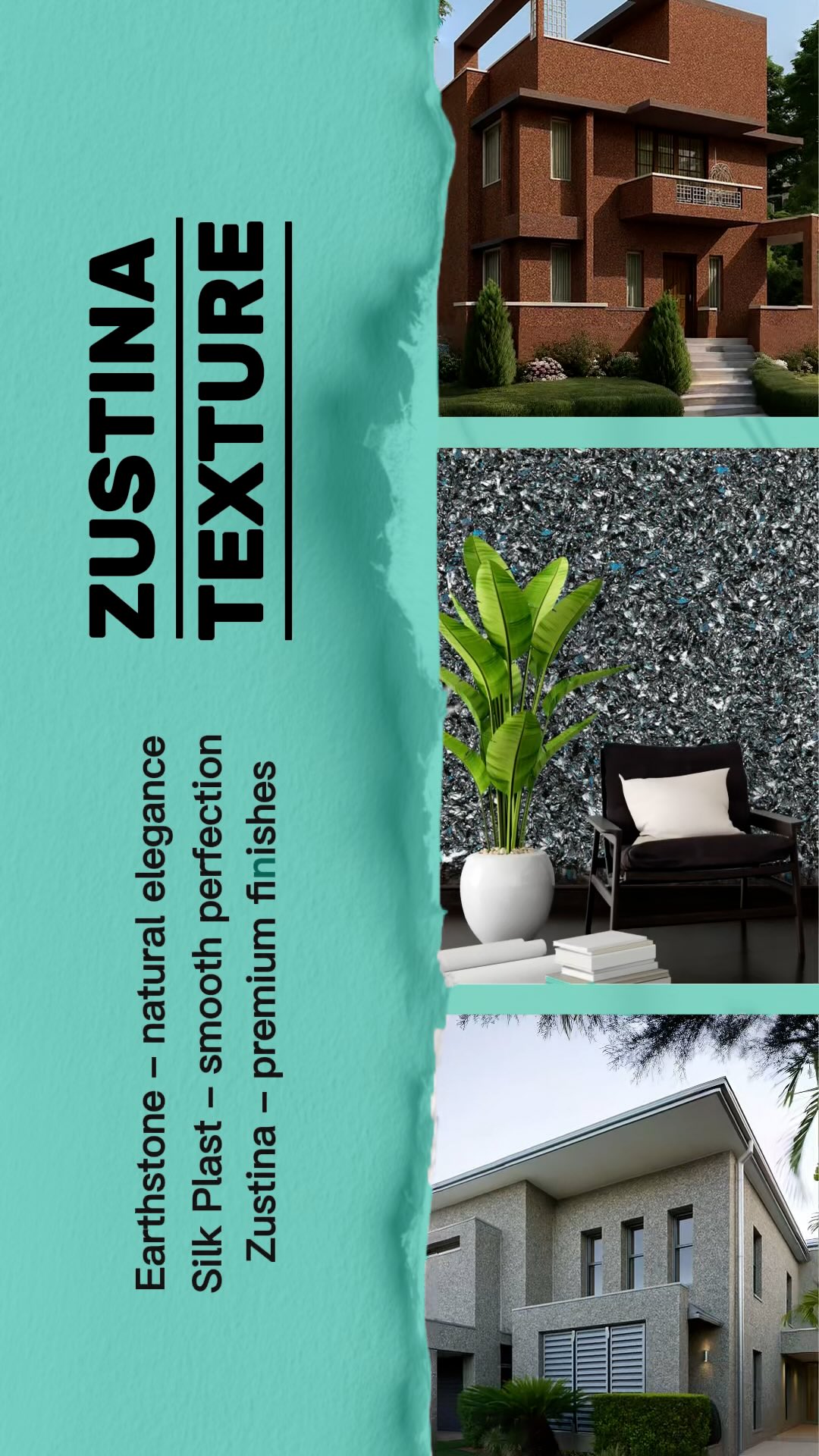 Zustina Earth Stone Marble Textures are premium natural stone–based wall finishes that deliver a rich marble look with a smooth, elegant texture. Durable, weather-resistant, and breathable, they are ideal for both interior and exterior walls, offering long-lasting beauty with a luxurious stone finish.